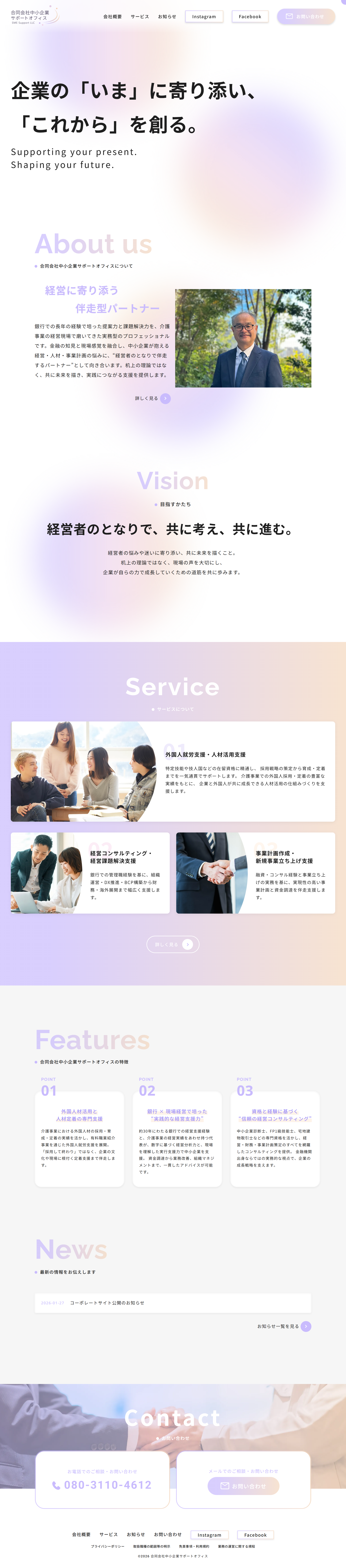 全体を通して、「経営者に寄り添い、共に考え、共に進む」という事業姿勢が視覚的にも伝わることを重視し、安心して相談できる印象を与えるコーポレートサイトを目指しました。